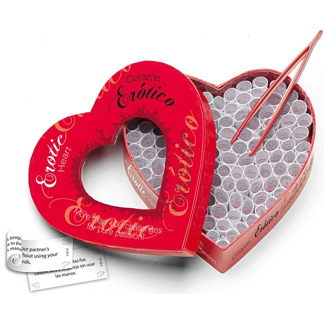 Uno de los dos elige un rollito de papel del corazón con unas pinzas que trae el juego. ¿Qué va a suceder? ¿Disfrutarán juntos de un juego de seducción, de un preludio amoroso, de una fantasía compartida o de una prueba erótica? Todo depende de que te diga la consigna.